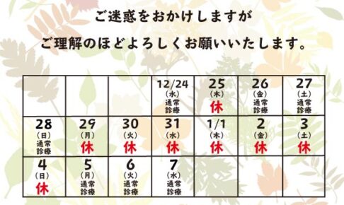 「森の葉整骨院」の12月の予定です。 当院では毎週木曜日と祝日にお休みをいただいております。 12月6日(金)は娘のお遊戯会のため、12時からになります。 あとは年末年始のお休みは12月29日(日)〜1月4…