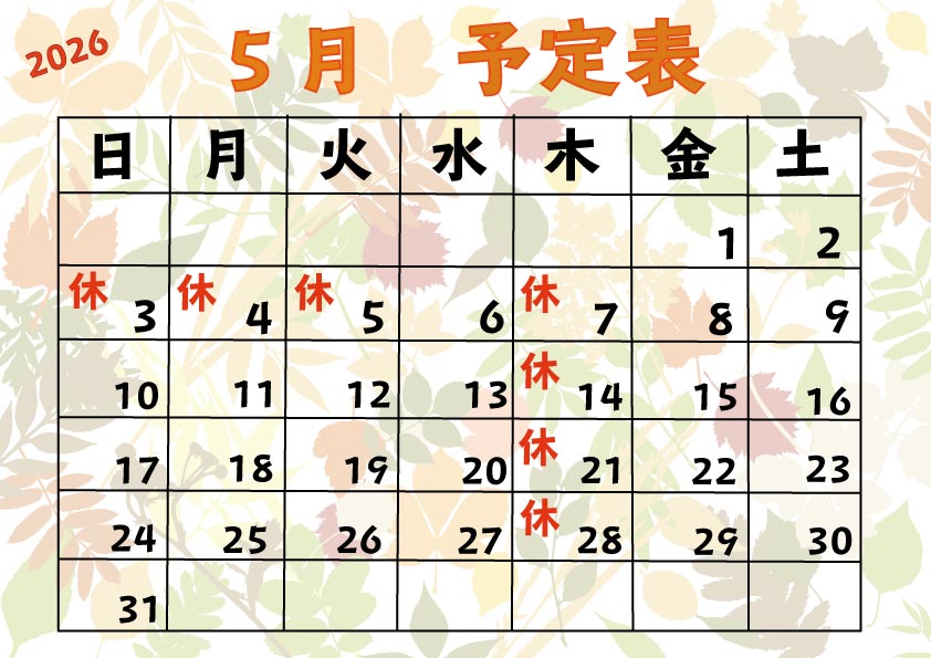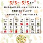 3日は憲法記念日、4日はみどりの日、5日はこどもの日でお休みをいただきます。